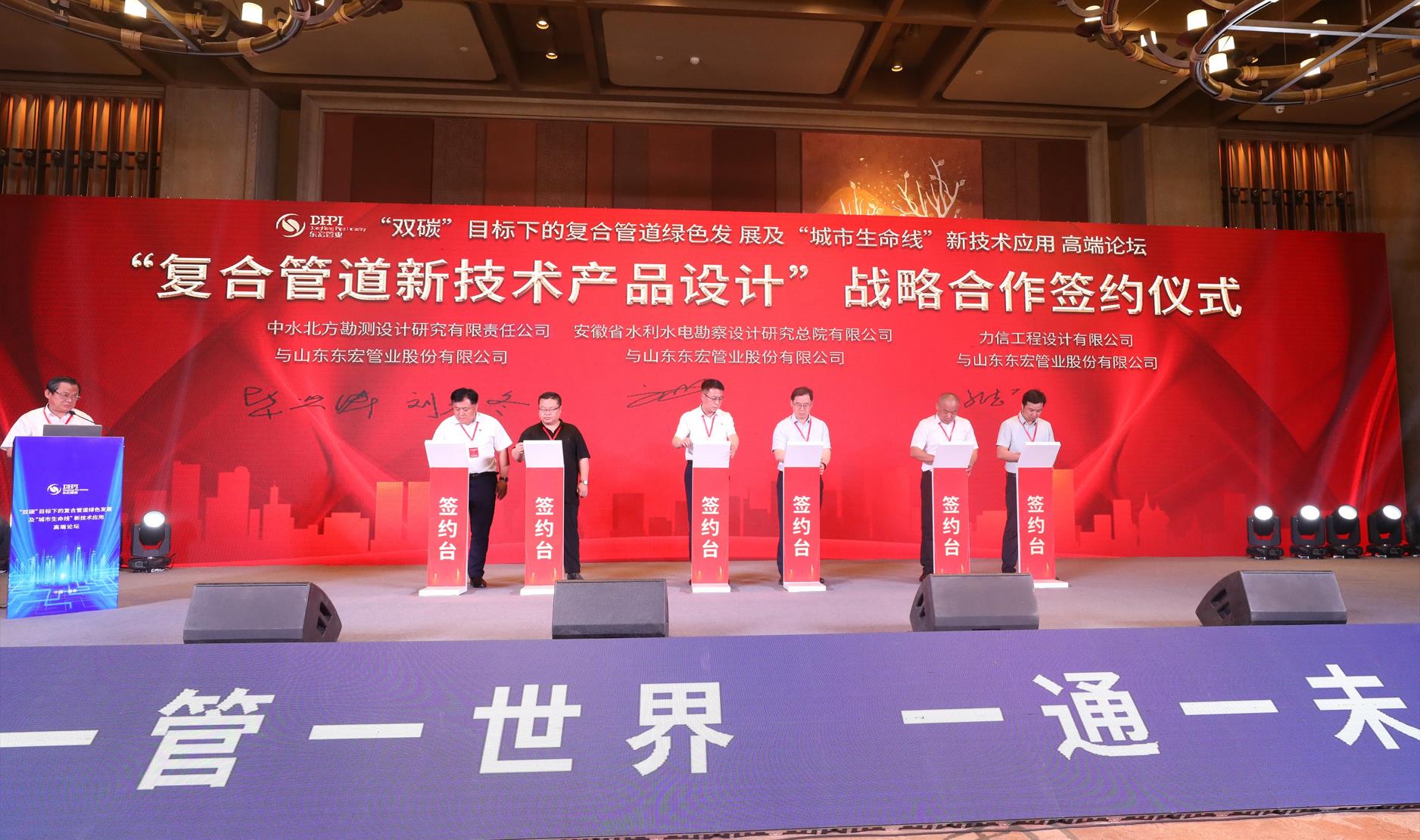 在8位業(yè)內(nèi)領(lǐng)軍專家的精彩分享之后,本次論壇進(jìn)入成果轉(zhuǎn)化環(huán)節(jié),多家領(lǐng)域內(nèi)代表性設(shè)計院和頭部企業(yè)與東宏股份進(jìn)行了“復(fù)合管道新技術(shù)產(chǎn)品設(shè)計”戰(zhàn)略合作簽約儀式和“復(fù)合管道新技術(shù)產(chǎn)品應(yīng)用”戰(zhàn)略合作簽約儀式。
